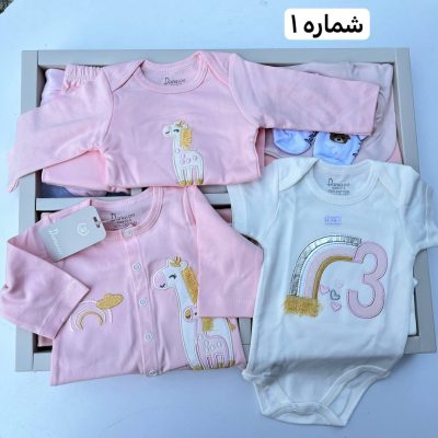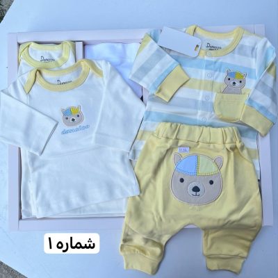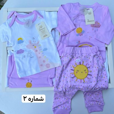 این ست 20 تیکه می باشد که عبارتند از جمله آستین بلند ساده – آستین کوتاه ساده – مانتو (جلو دکمه ) – ناف بند -رکابی ساده – دستکش – آستین کوتاه زیر دکمه -شورت عینکی – جوراب – دور پیچ نخی – دستمال نخی – روسری نخی – پیشنبد – کلاه بند دار – کلاه ساده – شلوار ساده و شلوار جوراب دار می باشد.
