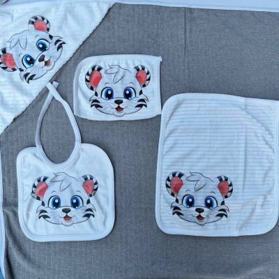 این ست شامل تن پوش ، حوله کلاه دار ، لیف ، پاپوش و پیش بند می باشد و قابل شستشو با دست و ماشین است ضمنا الیاف پنبه می باشد که دارای پرز ها کوتاه و قابلیت جذب رطوبت بالا بوده و ضد حساسیت می باشد .یکی از تکههای اصلی این ست را یک حولهی دورپیچ با کلاه سهگوش تشکیل میدهد. این حوله با ابعاد 70*65 سانتیمتر، برای خشککردن بدن نوزاد بعد از حمام، در ماههای آغازین تولد تا یکسالگی او استفاده میشود. کلاه سهگوش این حوله متناسب با سر نوزاد دوخته شده است و بهخوبی سر او را میپوشاند. تکهی دوم این مجموعه یک حولهی تنپوش کلاهدار با ابعاد 35*60 سانتیمتر است که از یکسالگی تا سه سالگی مناسب می باشد . این حولهی تنپوش بهواسطهی بند تعبیهشده در قسمت کمر آن بسته میشود.