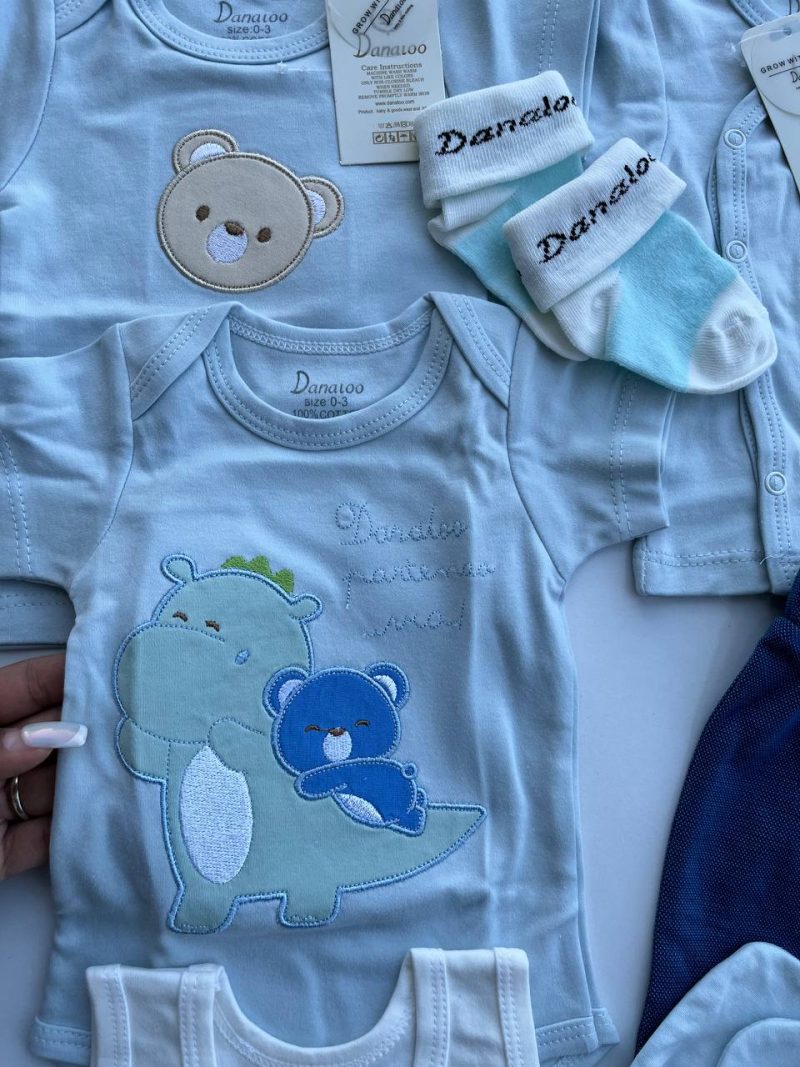 این ست 20 تیکه می باشد که عبارتند از جمله آستین بلند ساده – آستین کوتاه ساده – مانتو (جلو دکمه ) – ناف بند -رکابی ساده – دستکش – آستین کوتاه زیر دکمه -شورت عینکی – جوراب – دور پیچ نخی – دستمال نخی – روسری نخی – پیشنبد – کلاه بند دار – کلاه ساده – شلوار ساده و شلوار جوراب دار می باشد.