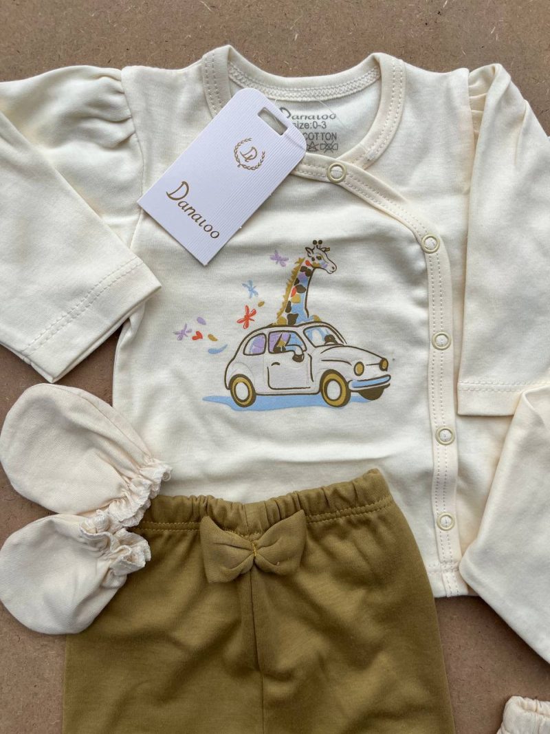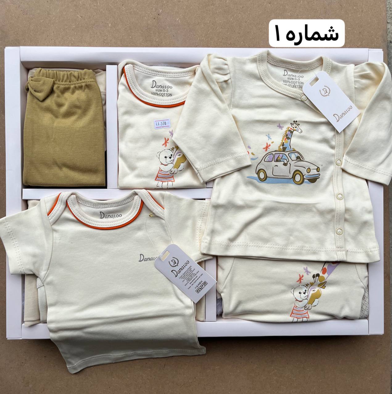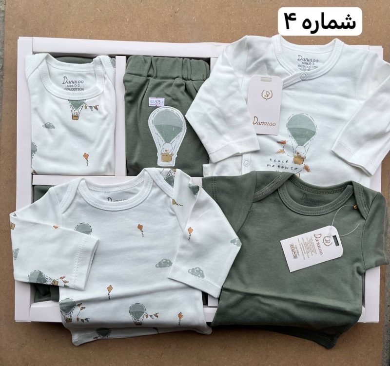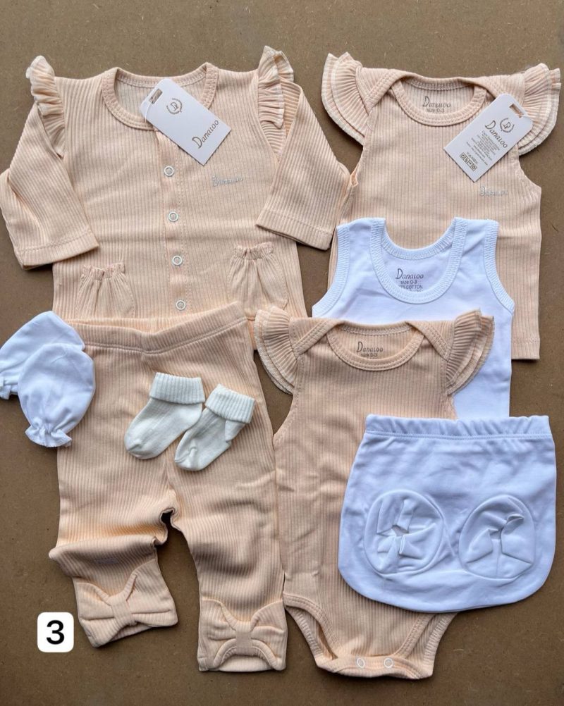 این ست 20 تیکه می باشد که عبارتند از جمله آستین بلند ساده – آستین کوتاه ساده – مانتو (جلو دکمه ) – ناف بند -رکابی ساده – دستکش – آستین کوتاه زیر دکمه -شورت عینکی – جوراب – دور پیچ نخی – دستمال نخی – روسری نخی – پیشنبد – کلاه بند دار – کلاه ساده – شلوار ساده و شلوار جوراب دار می باشد.