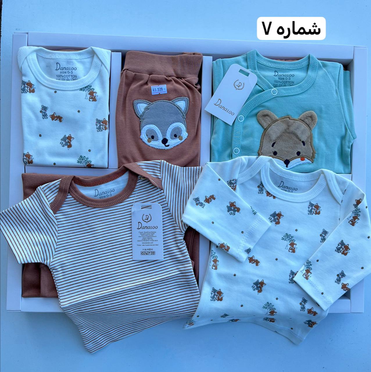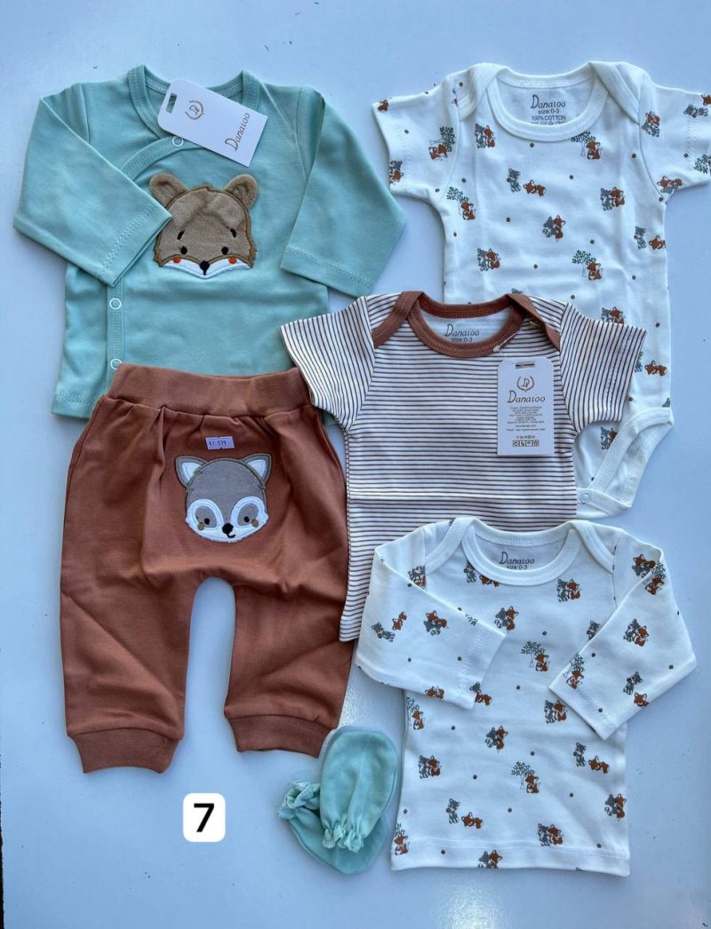 این ست 20 تیکه می باشد که عبارتند از جمله آستین بلند ساده – آستین کوتاه ساده – مانتو (جلو دکمه ) – ناف بند -رکابی ساده – دستکش – آستین کوتاه زیر دکمه -شورت عینکی – جوراب – دور پیچ نخی – دستمال نخی – روسری نخی – پیشنبد – کلاه بند دار – کلاه ساده – شلوار ساده و شلوار جوراب دار می باشد.