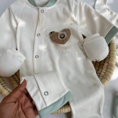 جنس نخ و پنبه صد درصد دارای:دستکش،سرهمی،پاپوش،دورپیچ کلاهدار،پیشبند،کلاه ،رگال مرواریدی مناسب ۰ تا ۳ ماه